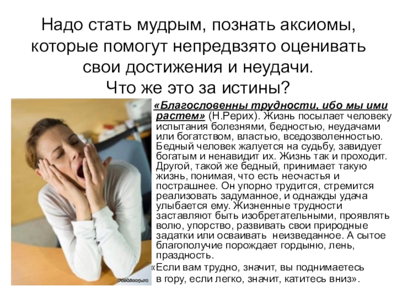 «Благословенны трудности, ибо мы ими растем» (Н.Рерих). Жизнь посылает человеку испытания болезнями, бедностью, неудачами или богатством, властью, вседозволенностью. Бедный человек жалуется на судьбу, завидует богатым и ненавидит их. Жизнь так и проходит. Другой, такой же бедный, принимает такую жизнь, понимая, что есть несчастья и пострашнее. Он упорно трудится, стремится реализовать задуманное, и однажды удача улыбается ему. Жизненные трудности заставляют быть изобретательными, проявлять волю, упорство, развивать свои природные задатки или осваивать неизведанное. А сытое благополучие порождает гордыню, лень, праздность.