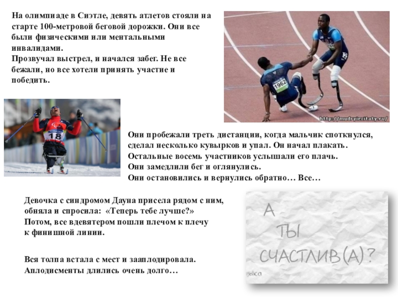Они пробежали треть дистанции, когда мальчик споткнулся, сделал несколько кувырков и упал. Он начал плакать.