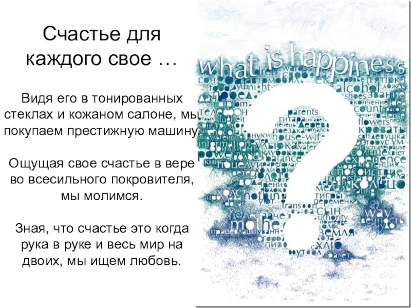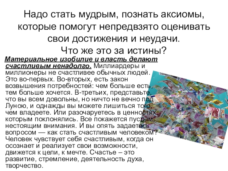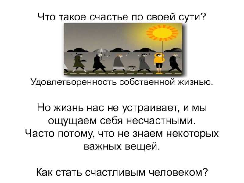 Материальное изобилие и власть делают счастливым ненадолго. Миллиардеры и миллионеры не счастливее обычных людей. Это во-первых. Во-вторых, есть закон возвышения потребностей: чем больше есть, тем больше хочется. В-третьих, представьте, что вы всем довольны, но ничто не вечно под Луною, и однажды вы можете лишиться того, чем владеете. Или разочаруетесь в ценностях, которым поклонялись. Все покажется пустым, нестоящим внимания. И вы опять задаетесь вопросом — как стать счастливым человеком? Человек чувствует себя счастливым, когда он осознает и реализует свои возможности, движется к цели, к мечте. Счастье – это развитие, стремление, деятельность духа, творчество.