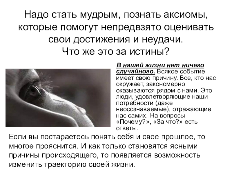 Если вы постараетесь понять себя и свое прошлое, то многое прояснится. И как только становятся ясными причины происходящего, то появляется возможность изменить траекторию своей жизни.