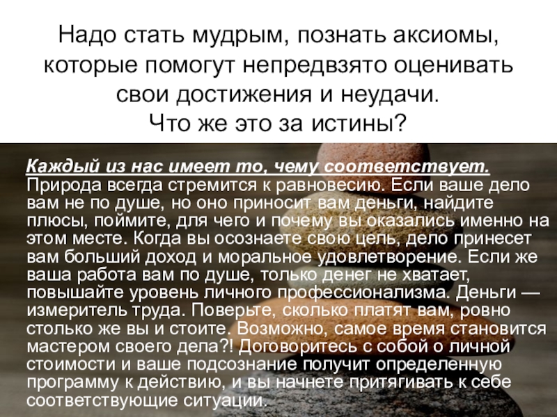 Каждый из нас имеет то, чему соответствует. Природа всегда стремится к равновесию. Если ваше дело вам не по душе, но оно приносит вам деньги, найдите плюсы, поймите, для чего и почему вы оказались именно на этом месте. Когда вы осознаете свою цель, дело принесет вам больший доход и моральное удовлетворение. Если же ваша работа вам по душе, только денег не хватает, повышайте уровень личного профессионализма. Деньги — измеритель труда. Поверьте, сколько платят вам, ровно столько же вы и стоите. Возможно, самое время становится мастером своего дела?! Договоритесь с собой о личной стоимости и ваше подсознание получит определенную программу к действию, и вы начнете притягивать к себе соответствующие ситуации.