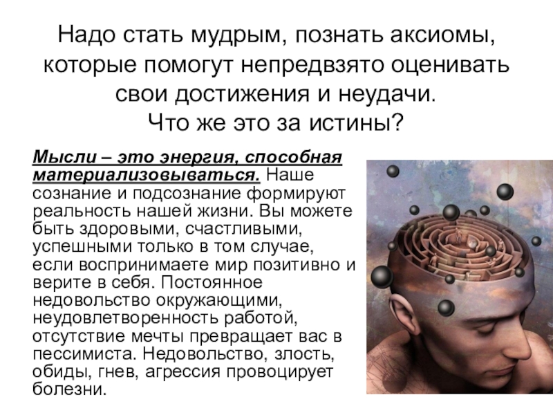 Мысли – это энергия, способная материализовываться. Наше сознание и подсознание формируют реальность нашей жизни. Вы можете быть здоровыми, счастливыми, успешными только в том случае, если воспринимаете мир позитивно и верите в себя. Постоянное недовольство окружающими, неудовлетворенность работой, отсутствие мечты превращает вас в пессимиста. Недовольство, злость, обиды, гнев, агрессия провоцирует болезни.