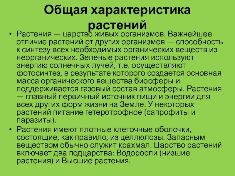 Растения имеют плотные клеточные оболочки, состоящие, как правило, из целлюлозы. Запасным веществом обычно служит крахмал. Царство растений включает два подцарства: Водоросли (низшие растения) и Высшие растения.