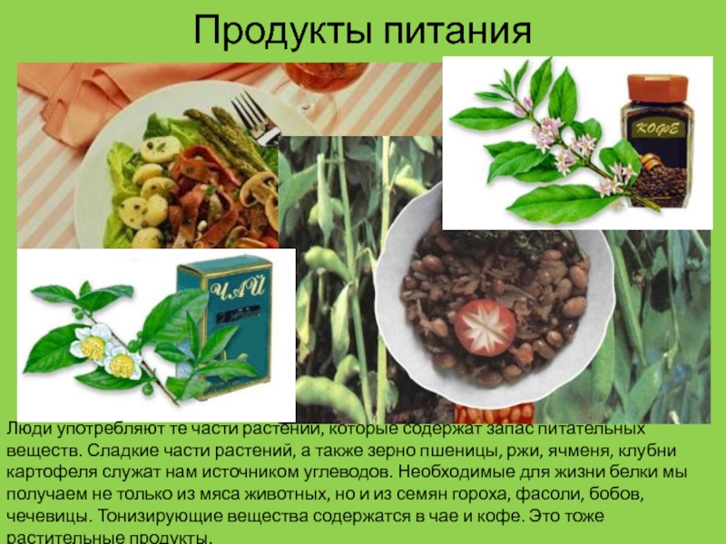 Сладкие части растений, а также зерно пшеницы, ржи, ячменя, клубни картофеля служат нам источником углеводов. Необходимые для жизни белки мы получаем не только из мяса животных, но и из семян гороха, фасоли, бобов, чечевицы. Тонизирующие вещества содержатся в чае и кофе. Это тоже растительные продукты.
