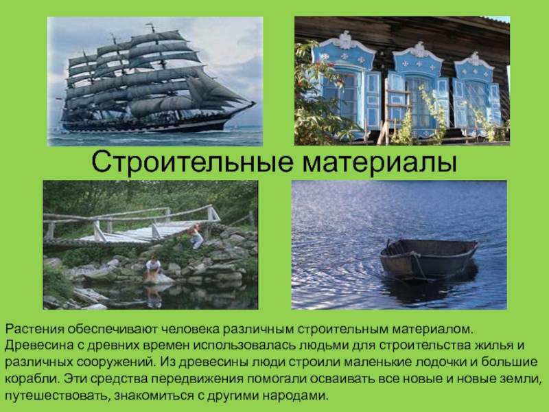 людьми для строительства жилья и различных сооружений. Из древесины люди строили маленькие лодочки и большие корабли. Эти средства передвижения помогали осваивать все новые и новые земли, путешествовать, знакомиться с другими народами.