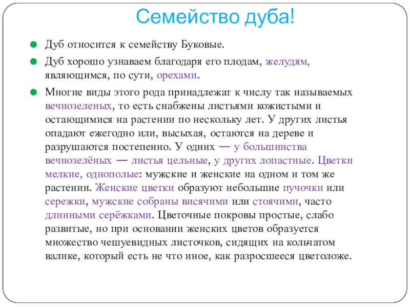 Семейство дуба!Дуб относится к семейству Буковые.Дуб хорошо узнаваем благодаря его плодам, желудям, являющимся, по сути, орехами.Многие виды этого рода принадлежат к числу так называемых вечнозеленых, то есть снабжены листьями кожистыми и остающимися на растении по нескольку