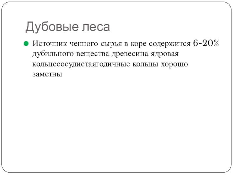 Дубовые лесаИсточник ченного сырья в коре содержится 6-20% дубильного вещества древесина ядровая кольцесосудистаягодичные кольцы хорошо заметны