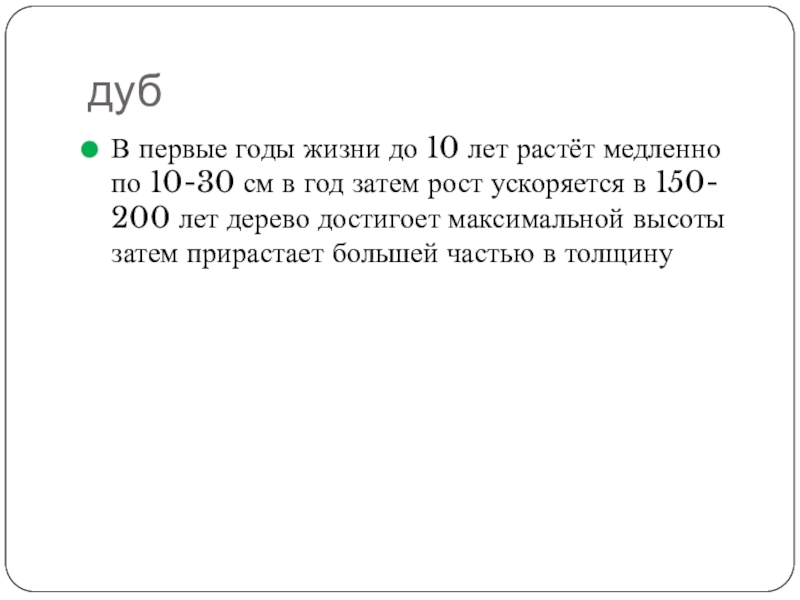 дубВ первые годы жизни до 10 лет растёт медленно по 10-30 см в год затем рост ускоряется