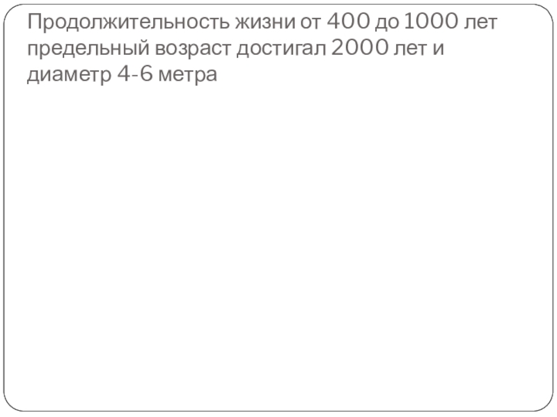 Продолжительность жизни от 400 до 1000 лет предельный возраст достигал 2000 лет и диаметр 4-6 метра