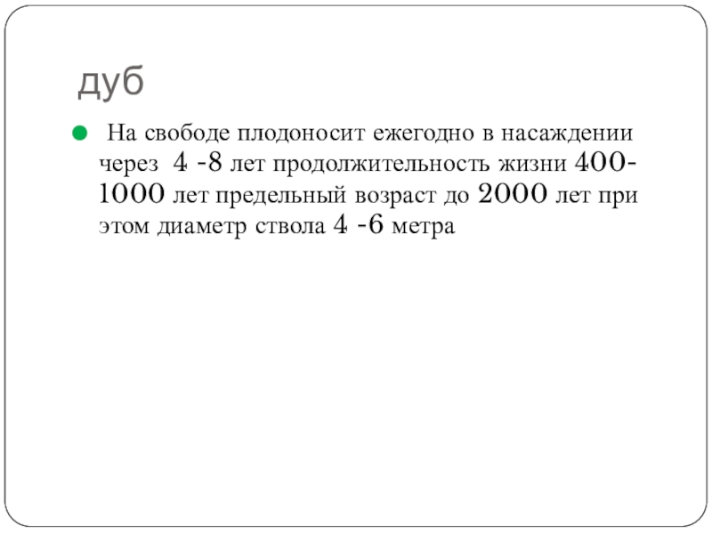 дуб На свободе плодоносит ежегодно в насаждении через 4 -8 лет продолжительность жизни 400- 1000 лет предельный