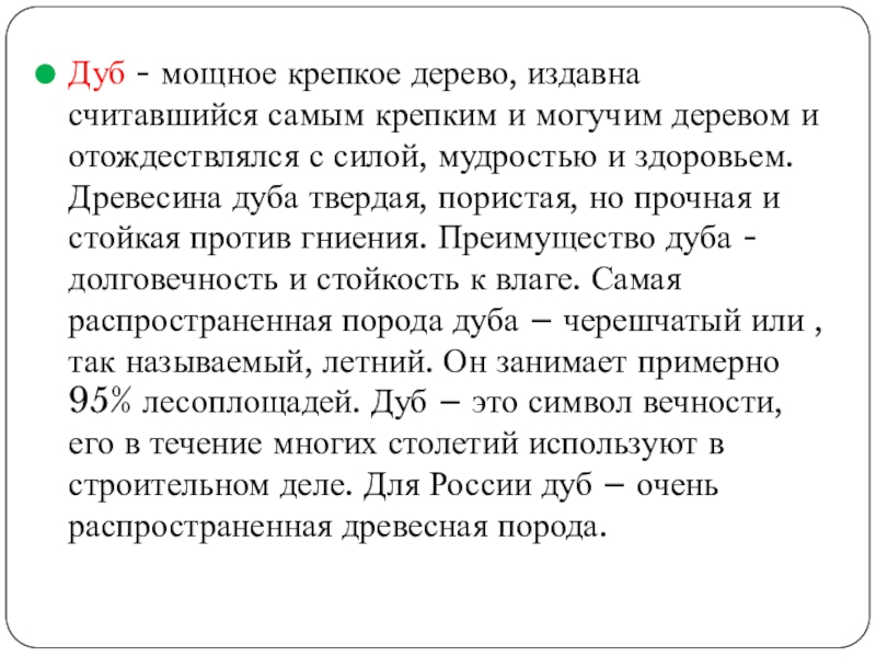 деревом и отождествлялся с силой, мудростью и здоровьем. Древесина дуба твердая, пористая, но прочная и стойкая против гниения. Преимущество дуба - долговечность и стойкость к влаге. Самая распространенная порода дуба – черешчатый или , так называемый, летний. Он занимает примерно 95% лесоплощадей. Дуб – это символ вечности, его в течение многих столетий используют в строительном деле. Для России дуб – очень распространенная древесная порода.