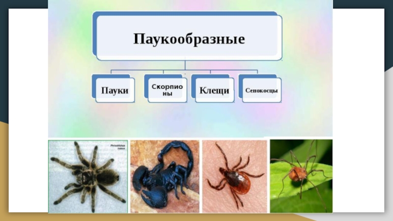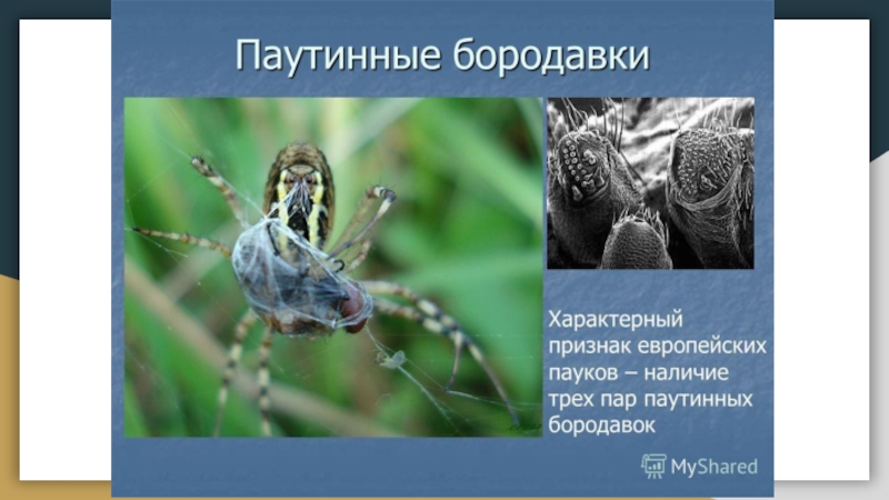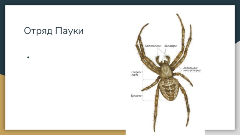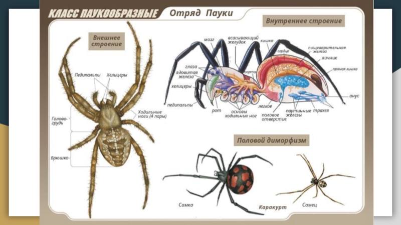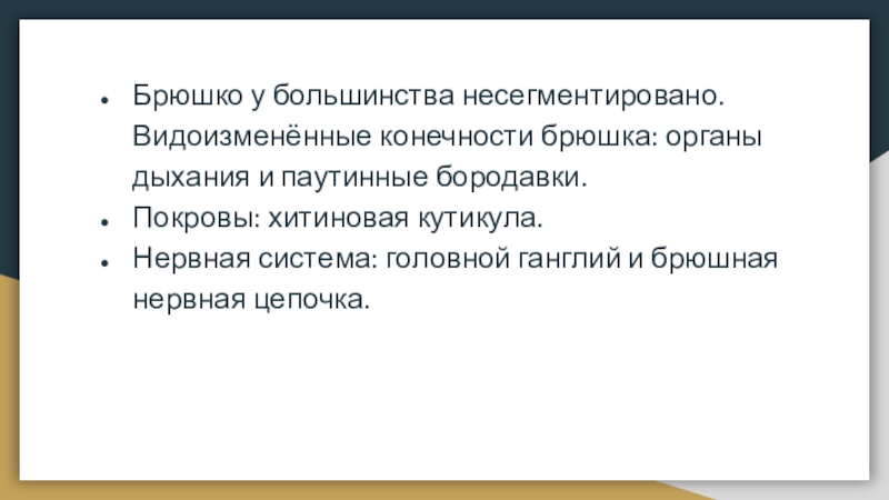 Слайд 16Брюшко у большинства несегментировано. Видоизменённые конечности брюшка: органы дыхания и паутинные