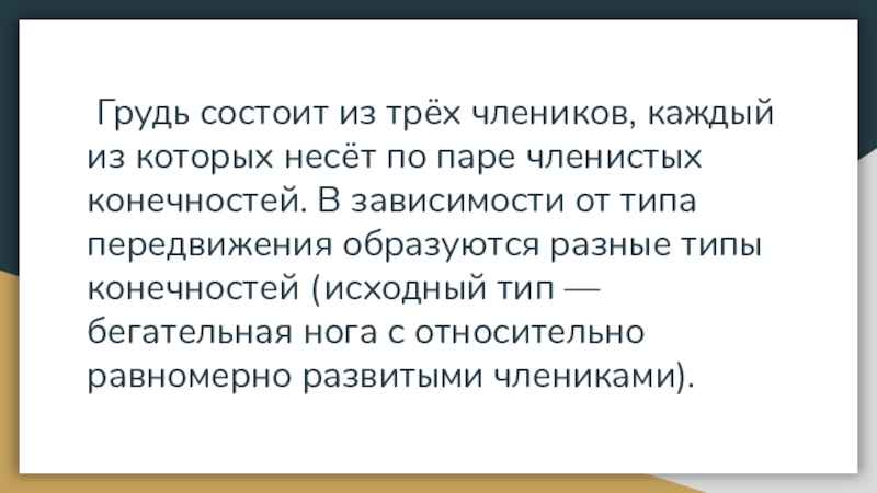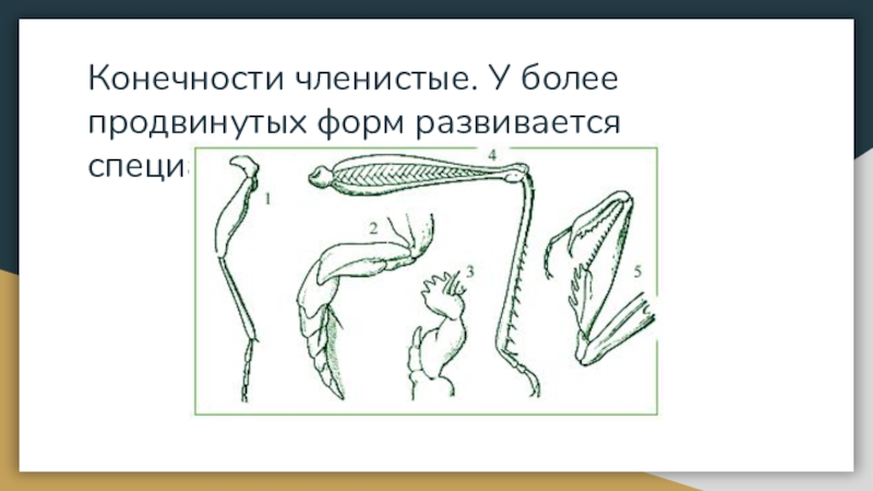 Слайд 5Конечности членистые. У более продвинутых форм развивается специализация конечностей.