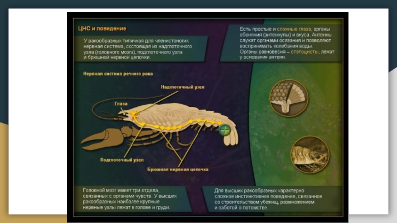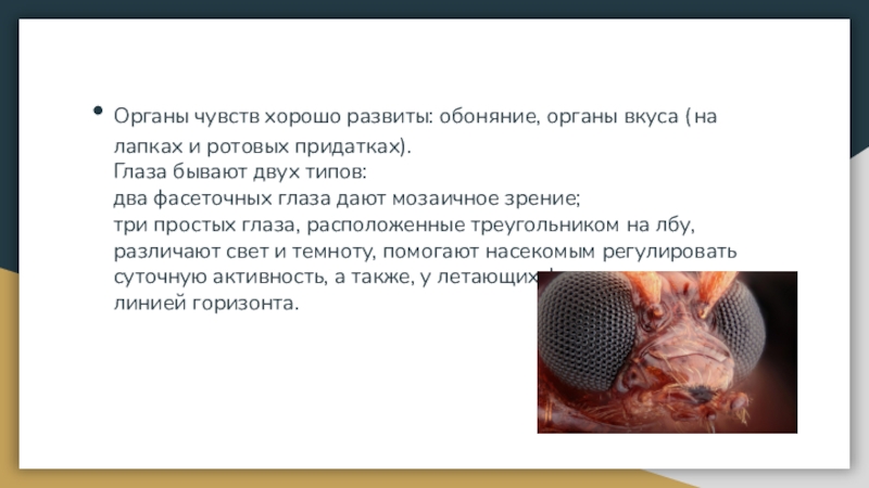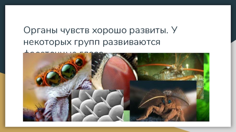 Слайд 8Органы чувств хорошо развиты. У некоторых групп развиваются фасеточные глаза.