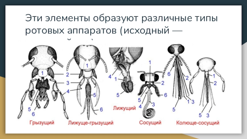 Слайд 36Эти элементы образуют различные типы ротовых аппаратов (исходный — грызущий тип).