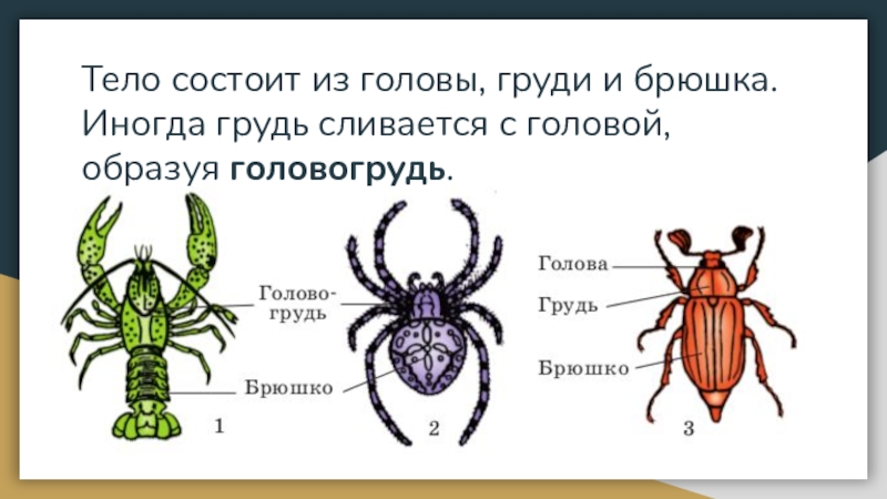 Слайд 4Тело состоит из головы, груди и брюшка. Иногда грудь сливается с