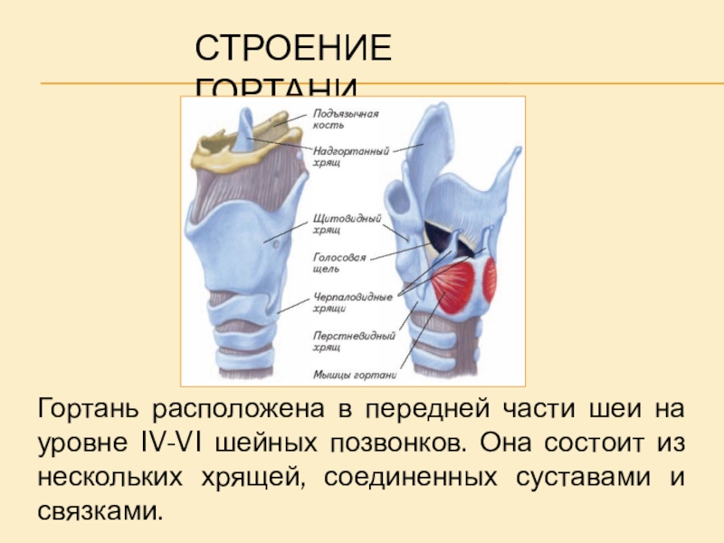 Строение гортаниГортань расположена в передней части шеи на уровне IV-VI шейных позвонков. Она состоит из нескольких хрящей,
