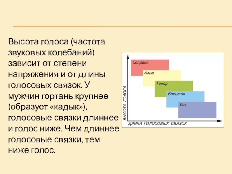 Высота голоса (частота звуковых колебаний) зависит от степени напряжения и от длины голосовых связок. У мужчин