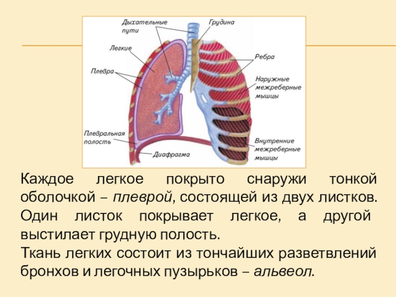 Слайд 13Каждое легкое покрыто снаружи тонкой оболочкой – плеврой, состоящей из двух