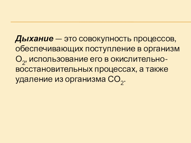 Дыхание — это совокупность процессов, обеспечивающих поступление в организм О2, использование его в окислительно-восстановительных процессах,