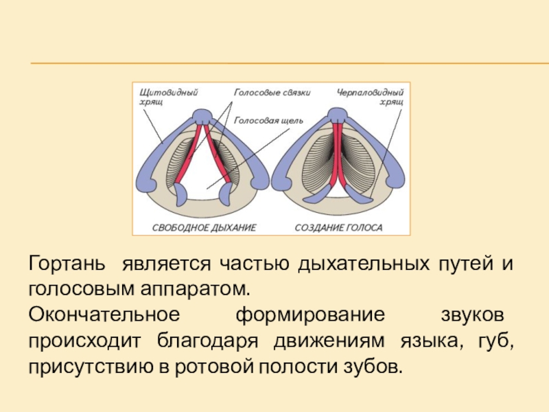Гортань является частью дыхательных путей и голосовым аппаратом.Окончательное формирование звуков происходит благодаря движениям языка, губ, присутствию в