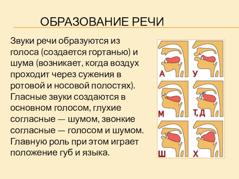 когда воздух проходит через сужения в ротовой и носовой полостях). Гласные звуки создаются в основном голосом, глухие согласные — шумом, звонкие согласные — голосом и шумом. Главную роль при этом играет положение губ и языка.