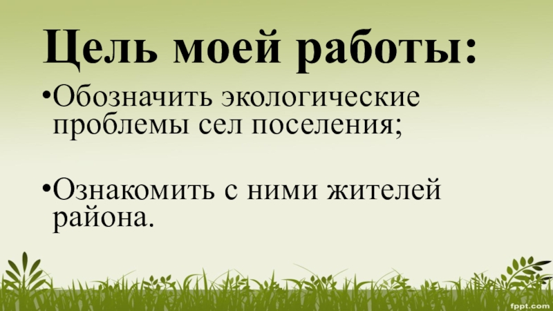 Цель моей работы:Обозначить экологические проблемы сел поселения;Ознакомить с ними жителей района.