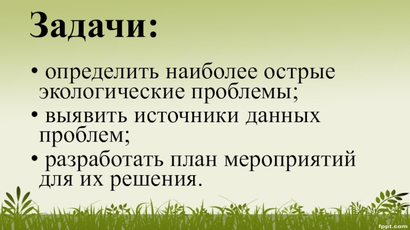 определить наиболее острые экологические проблемы; выявить источники данных проблем; разработать план мероприятий для их решения. Задачи: