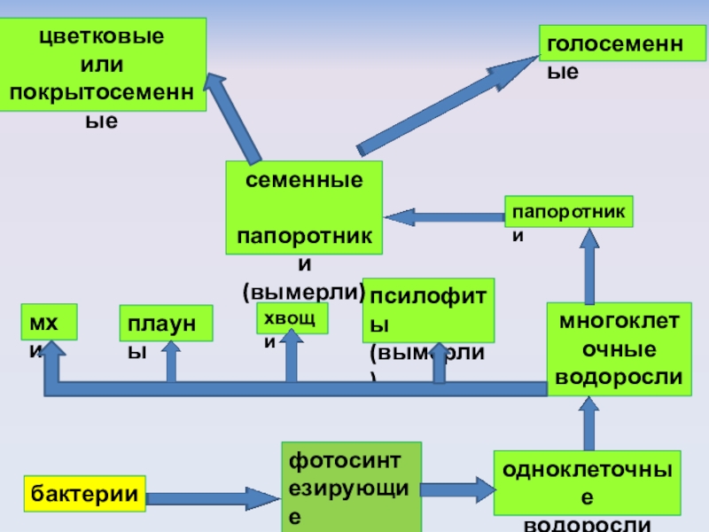 бактериифотосинтезирующиебактерииодноклеточныеводорослимногоклеточныеводорослимхиплауныпсилофиты(вымерли)папоротникисеменные папоротники(вымерли)хвощицветковыеили покрытосеменныеголосеменные