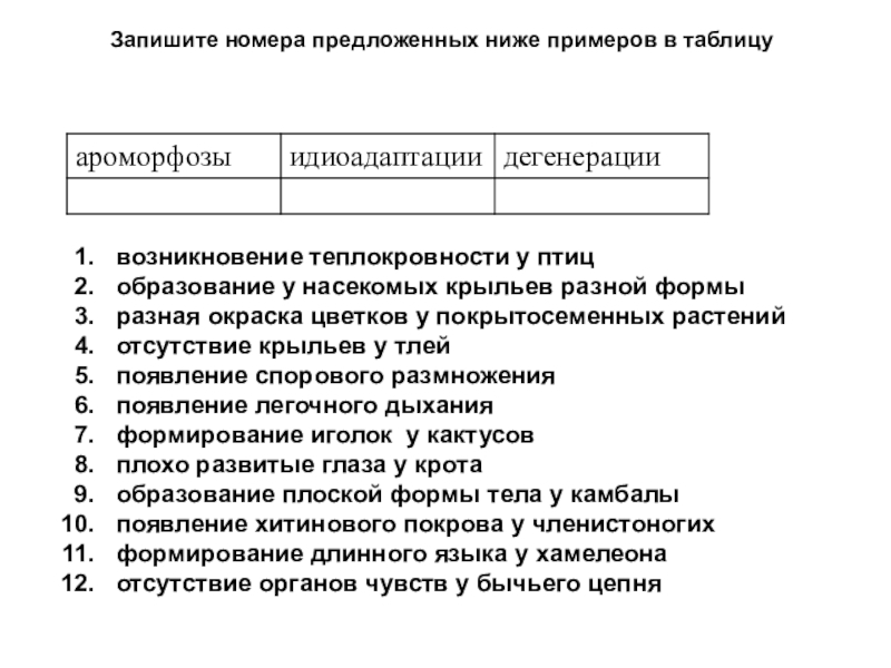 Запишите номера предложенных ниже примеров в таблицувозникновение теплокровности у птицобразование у насекомых крыльев разной формыразная окраска цветков