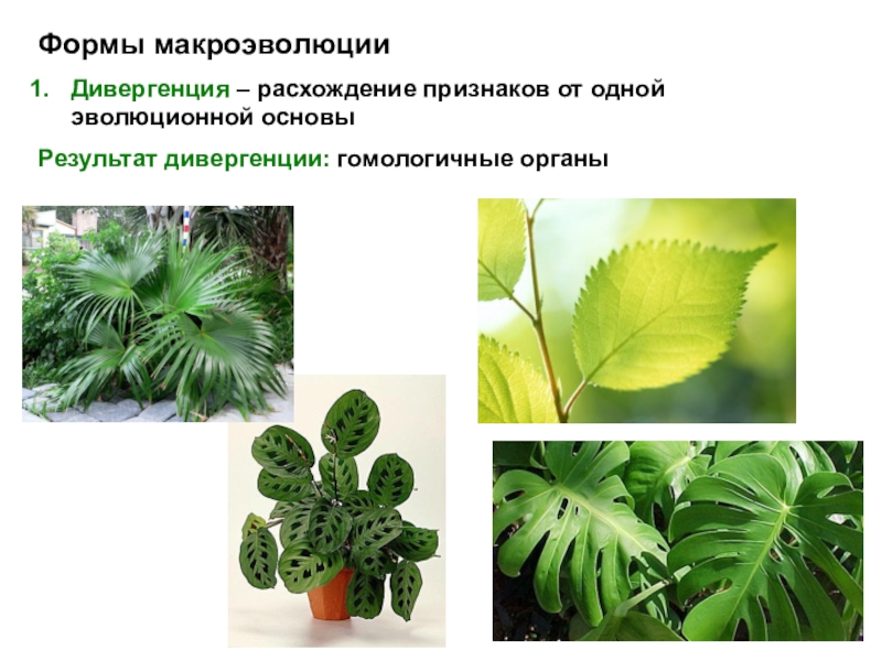 Формы макроэволюцииДивергенция – расхождение признаков от одной эволюционной основыРезультат дивергенции: гомологичные органы