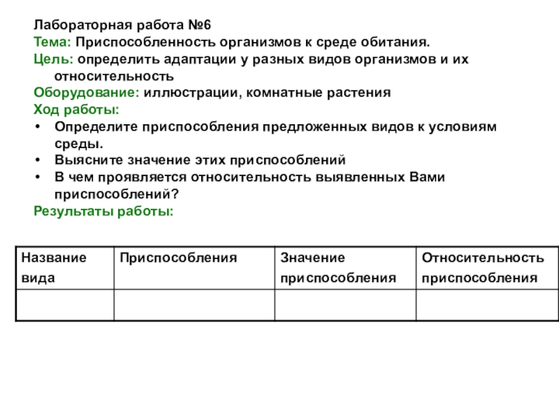 Лабораторная работа №6Тема: Приспособленность организмов к среде обитания.Цель: определить адаптации у разных видов организмов и их относительностьОборудование: