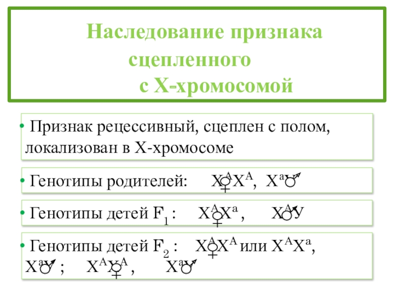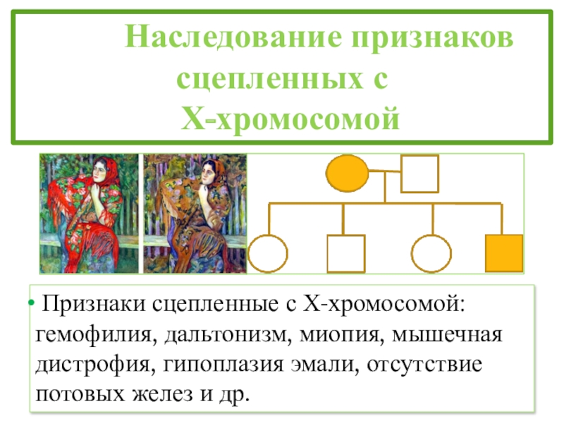 Признаки сцепленные с Х-хромосомой: гемофилия, дальтонизм, миопия, мышечная дистрофия, гипоплазия эмали, отсутствие потовых желез и др.