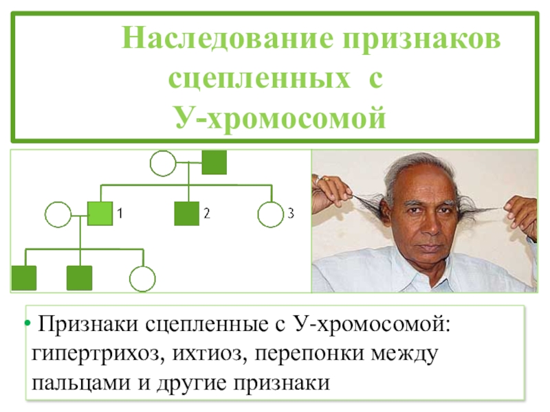 Признаки сцепленные с У-хромосомой: гипертрихоз, ихтиоз, перепонки между пальцами и другие признаки