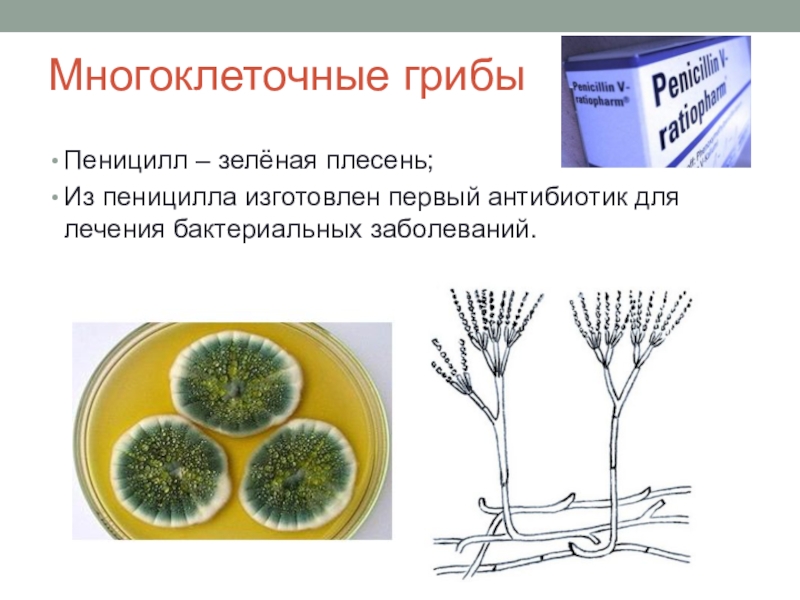 Многоклеточные грибыПеницилл – зелёная плесень;Из пеницилла изготовлен первый антибиотик для лечения бактериальных заболеваний.