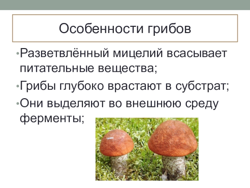 Особенности грибовРазветвлённый мицелий всасывает питательные вещества;Грибы глубоко врастают в субстрат;Они выделяют во внешнюю среду ферменты;