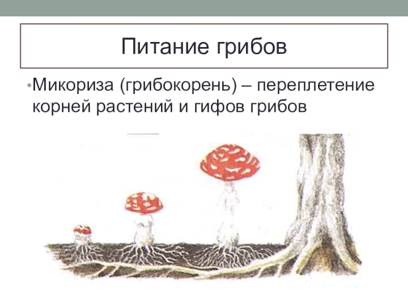 Питание грибовМикориза (грибокорень) – переплетение корней растений и гифов грибов