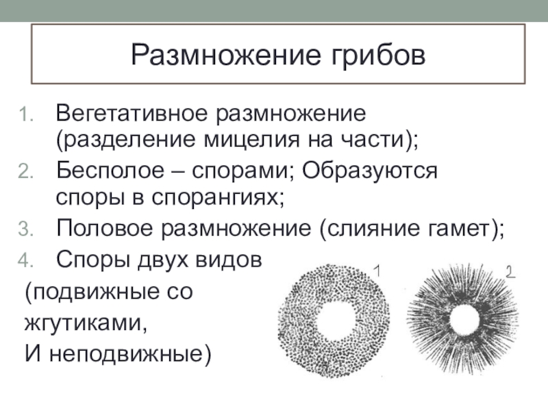 Размножение грибовВегетативное размножение (разделение мицелия на части);Бесполое – спорами; Образуются споры в спорангиях;Половое размножение (слияние гамет);Споры двух