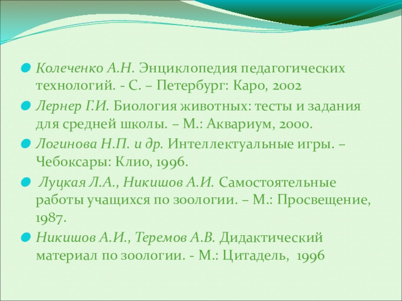 Лернер Г.И. Биология животных: тесты и задания для средней школы. – М.: Аквариум, 2000.
