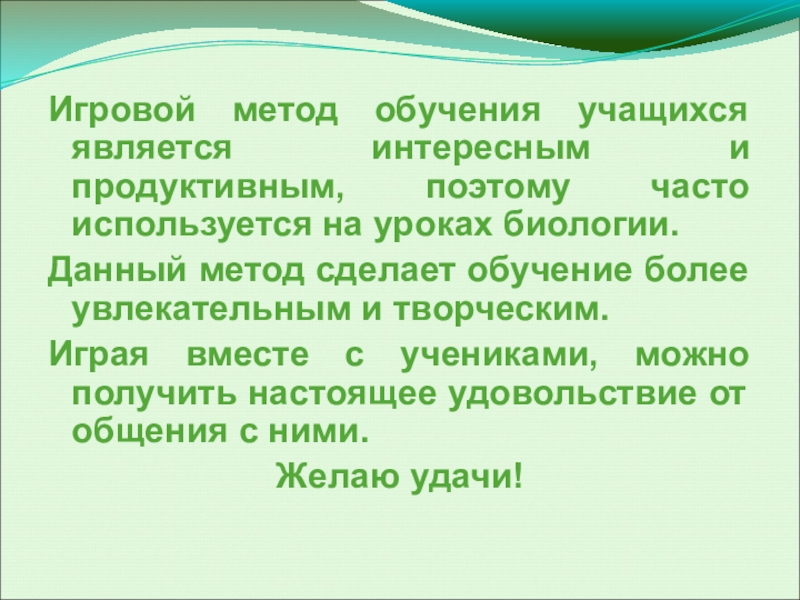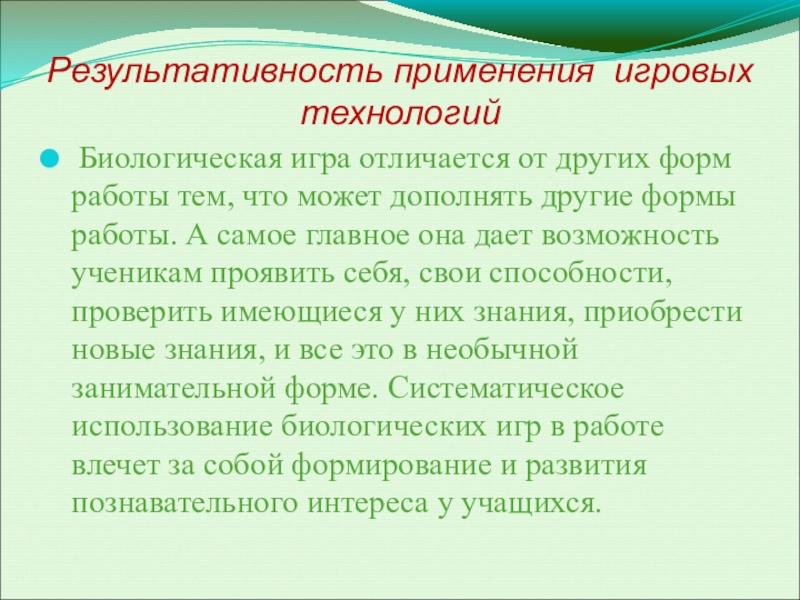 тем, что может дополнять другие формы работы. А самое главное она дает возможность ученикам проявить себя, свои способности, проверить имеющиеся у них знания, приобрести новые знания, и все это в необычной занимательной форме. Систематическое использование биологических игр в работе влечет за собой формирование и развития познавательного интереса у учащихся.