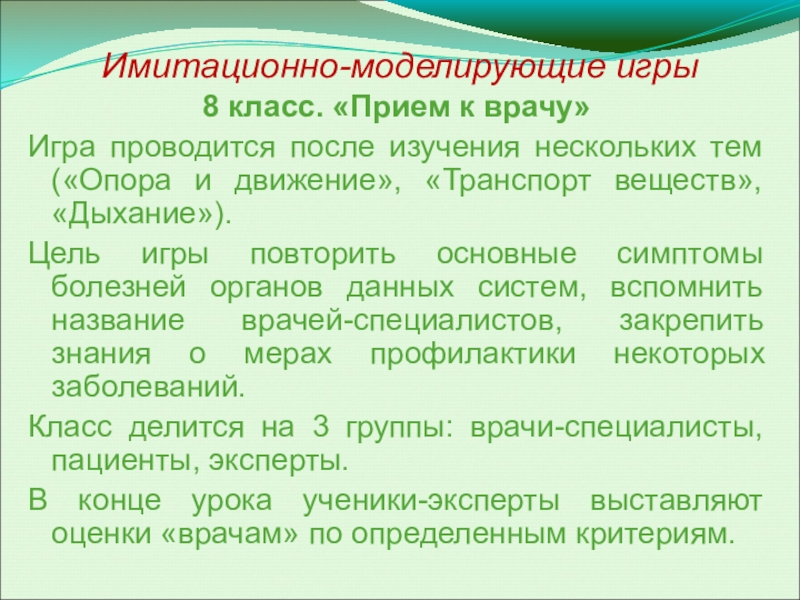 Цель игры повторить основные симптомы болезней органов данных систем, вспомнить название врачей-специалистов, закрепить знания о мерах профилактики некоторых заболеваний.