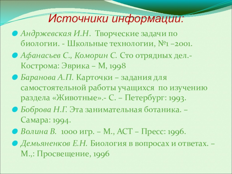 Баранова А.П. Карточки – задания для самостоятельной работы учащихся по изучению раздела «Животные».- С. – Петербург: 1993.