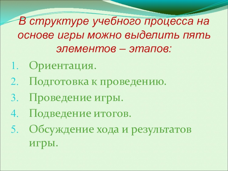 Слайд 8В структуре учебного процесса на основе игры можно выделить пять элементов