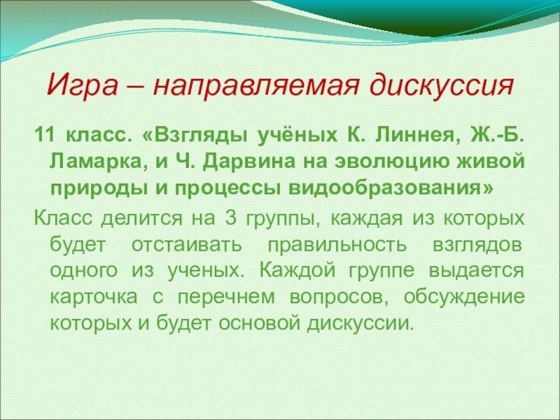 Класс делится на 3 группы, каждая из которых будет отстаивать правильность взглядов одного из ученых. Каждой группе выдается карточка с перечнем вопросов, обсуждение которых и будет основой дискуссии.