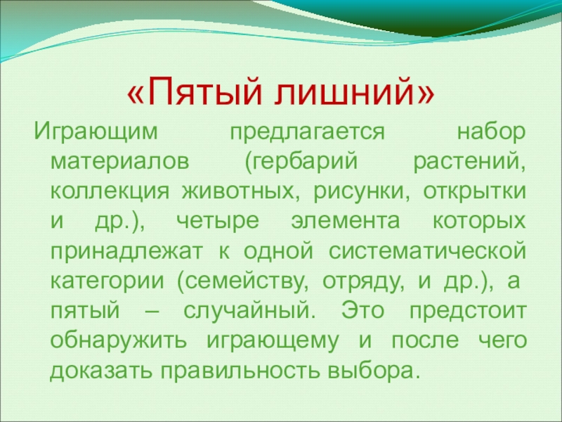 и др.), четыре элемента которых принадлежат к одной систематической категории (семейству, отряду, и др.), а пятый – случайный. Это предстоит обнаружить играющему и после чего доказать правильность выбора.