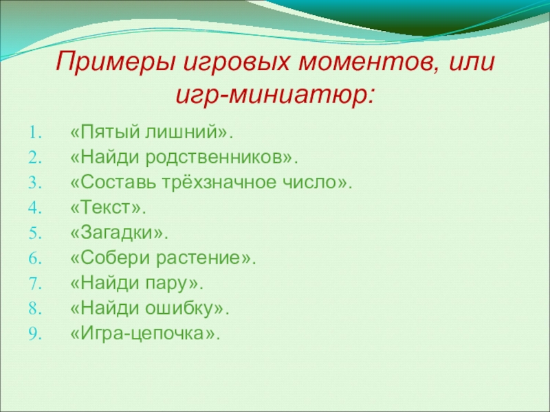 Слайд 15Примеры игровых моментов, или игр-миниатюр: