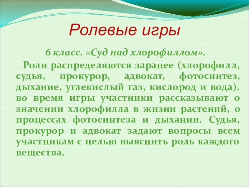 (хлорофилл, судья, прокурор, адвокат, фотосинтез, дыхание, углекислый газ, кислород и вода).во время игры участники рассказывают о значении хлорофилла в жизни растений, о процессах фотосинтеза и дыхании. Судья, прокурор и адвокат задают вопросы всем участникам с целью выяснить роль каждого вещества.