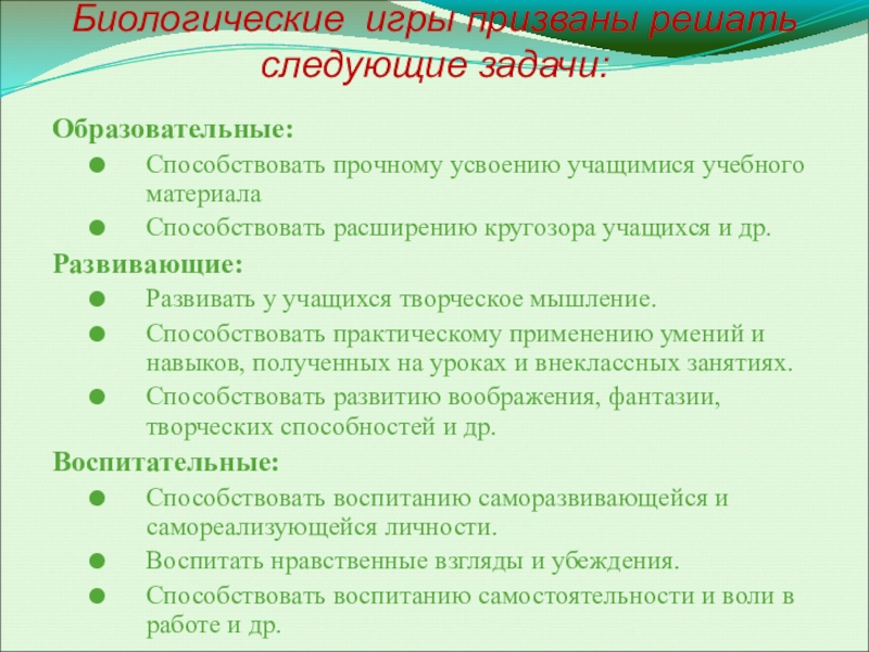 Слайд 5Биологические игры призваны решать следующие задачи: