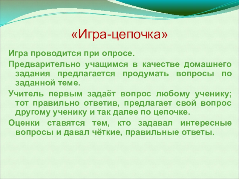 Учитель первым задаёт вопрос любому ученику; тот правильно ответив, предлагает свой вопрос другому ученику и так далее по цепочке.