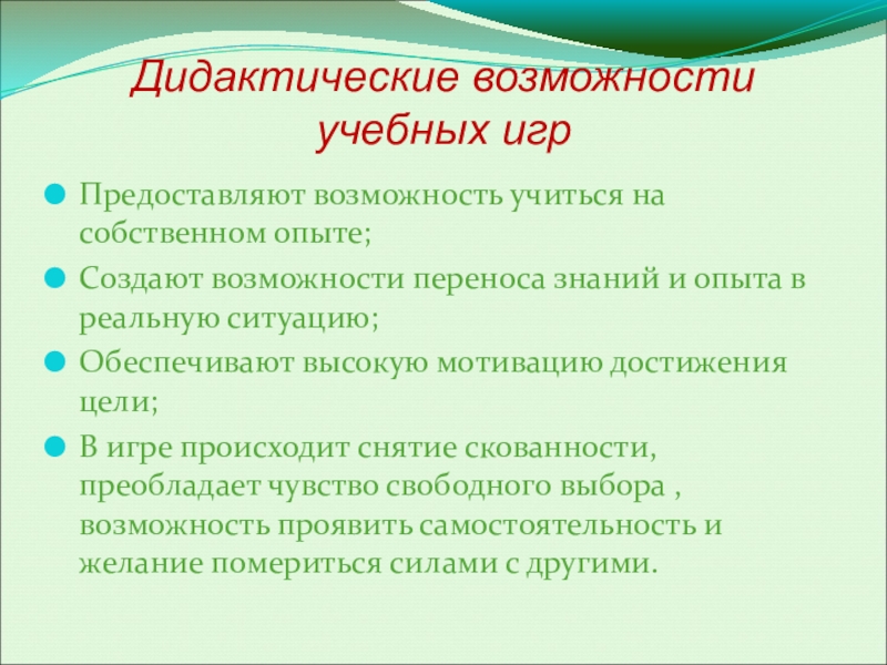 Слайд 7Дидактические возможности учебных игр